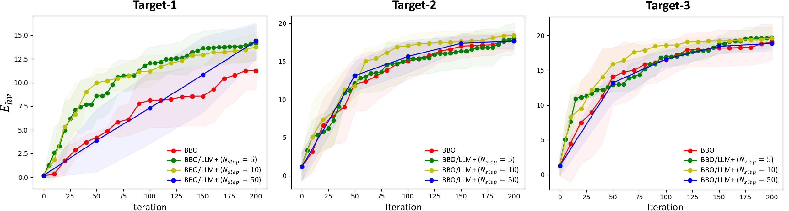 The LLM receives the problem settings and feedback from sampled solutions to propose additional designs. This allows broader exploration while the black-box optimizer focuses on precise numeric refinement.