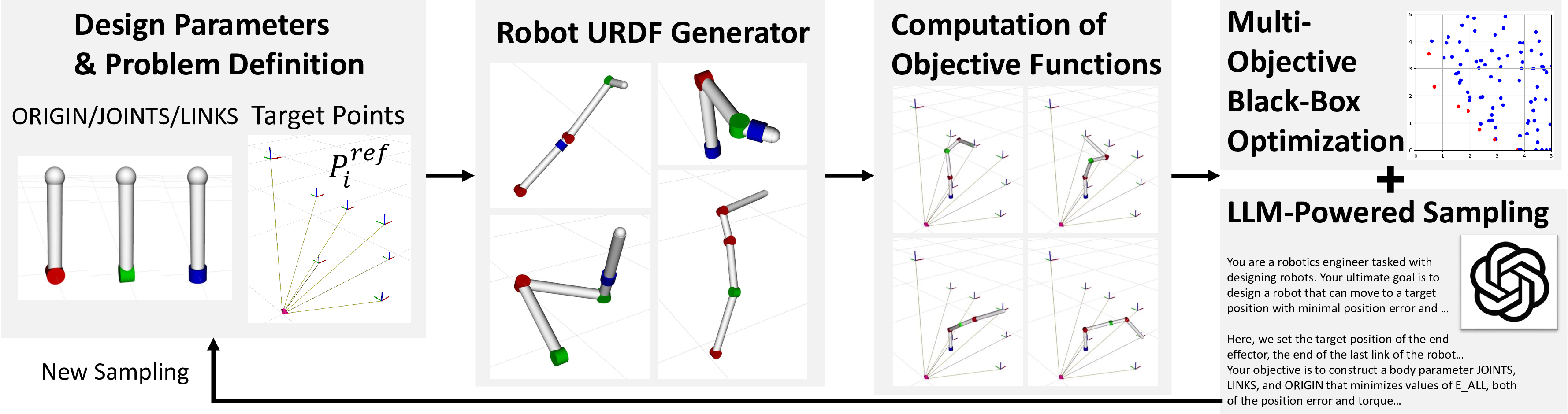 We set the robot design parameters, automatically generate the robot URDF, compute objective functions, and perform multi-objective black-box optimization with LLM-based sampling in parallel.